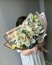 Нежный букет с орхидеями — изысканная композиция, сочетающая элегантную орхидею цимбидиум и белоснежную эустому. Акцент на свежести придаёт веточка эвкалипта. Идеальный выбор для выражения чувств и восхищения, подходит для любых торжественных моментов и не только.