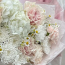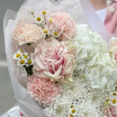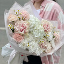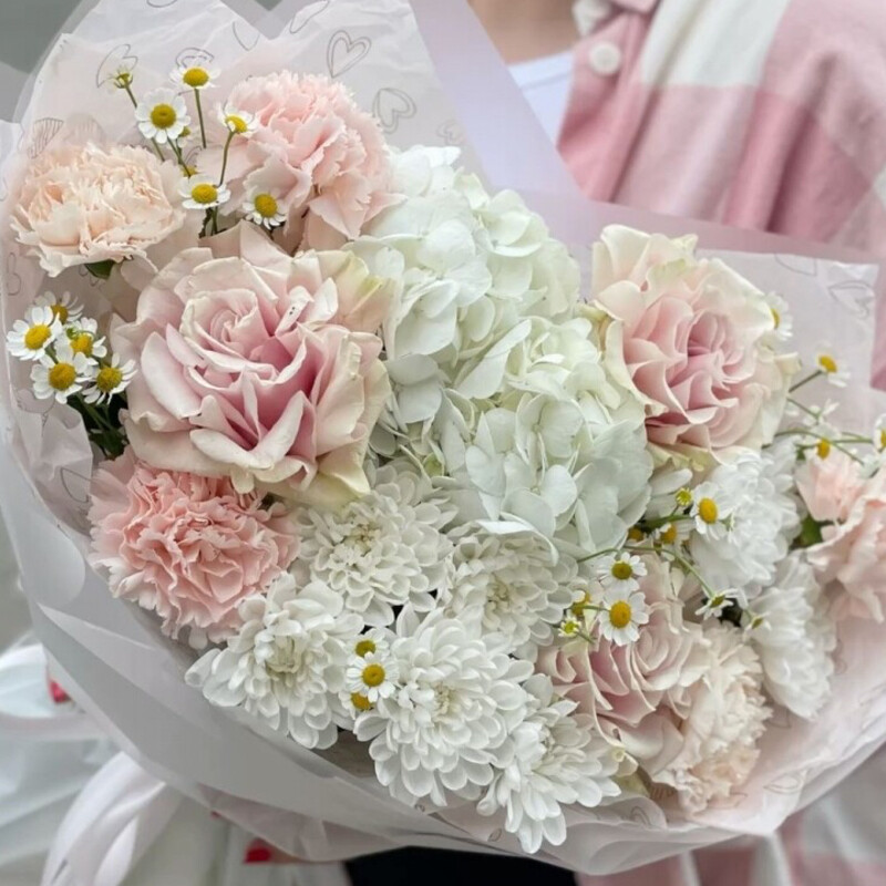 Авторский букет «Неженка» — изысканная композиция из гортензии, кустовой хризантемы, эквадорской розы, ромашки Камилла и гвоздики. Элегантное оформление, тишью и атласная лента дополняют образ. Подходит для любых случаев и никого не оставит равнодушным.
