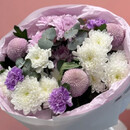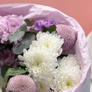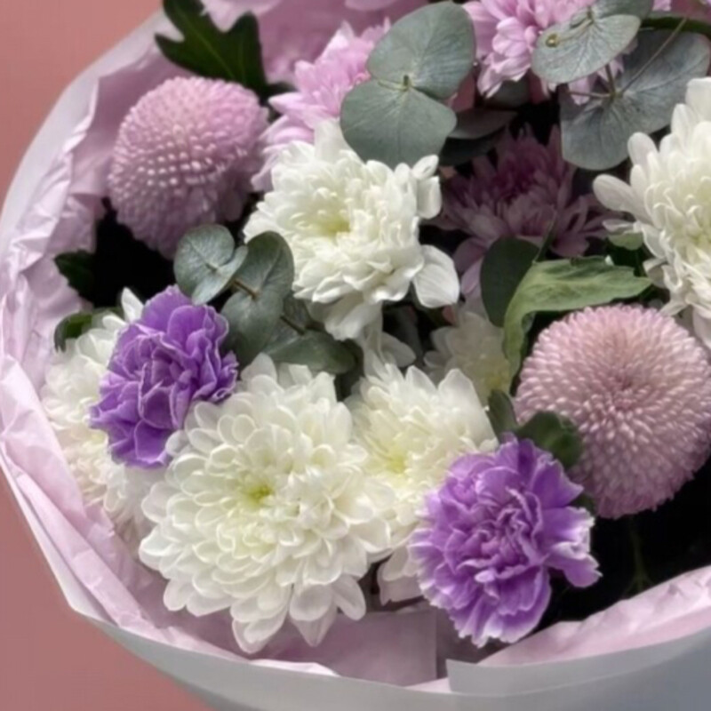 Момоко — авторский букет с кустовой и одноголовой хризантемой, гвоздикой и эвкалиптом. Изысканная композиция в атласной ленте подойдёт для любого случая и порадует получателя своей свежестью и красотой.