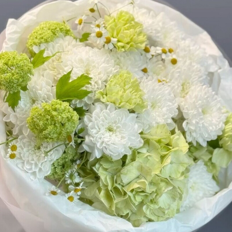 Авторский букет «Лайм» — гармоничная композиция из гвоздики, гортензии, кустовой хризантемы и ромашки. Подходит для выражения самых разных чувств и эмоций, идеален для любого случая. Отличный выбор для близких и коллег.