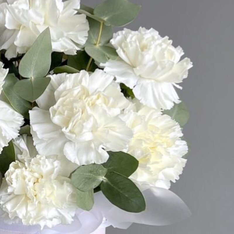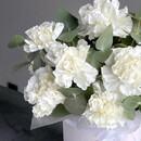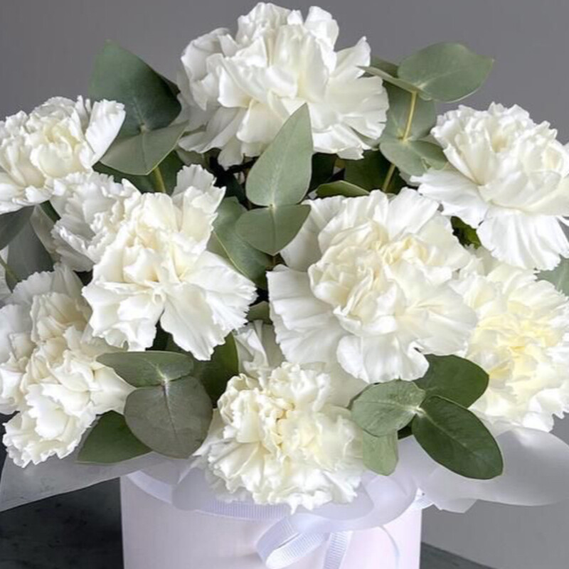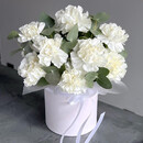 Композиция «Белоснежка» — это изысканная аранжировка с гвоздикой и эвкалиптом в шляпной коробке. Идеальна для любых случаев и подойдёт в качестве подарка для человека любого возраста.