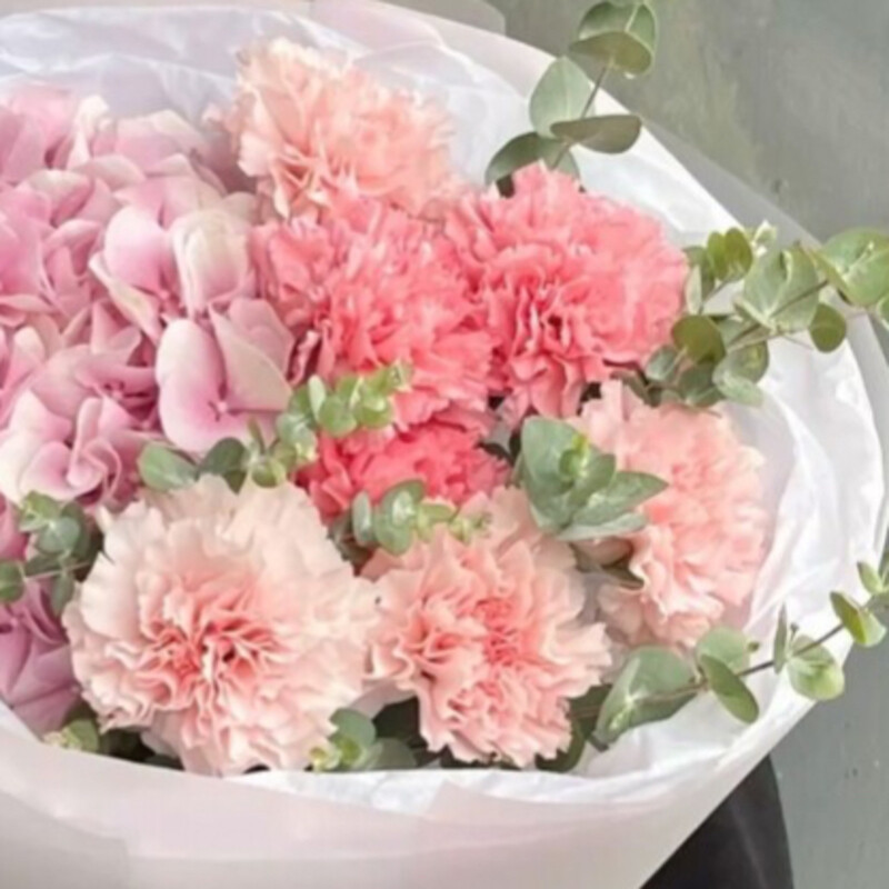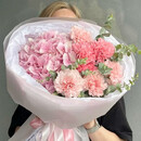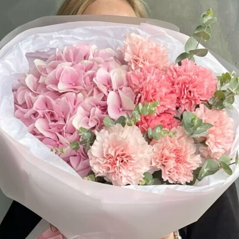 Букет «Клубничный йогурт» авторский — это изысканная композиция, в которой гармонично сочетаются гортензия и гвоздика, дополненные эвкалиптом. Оформление придаёт букету завершённость. Подходит для любых случаев и идеально подойдёт в качестве подарка для близких.