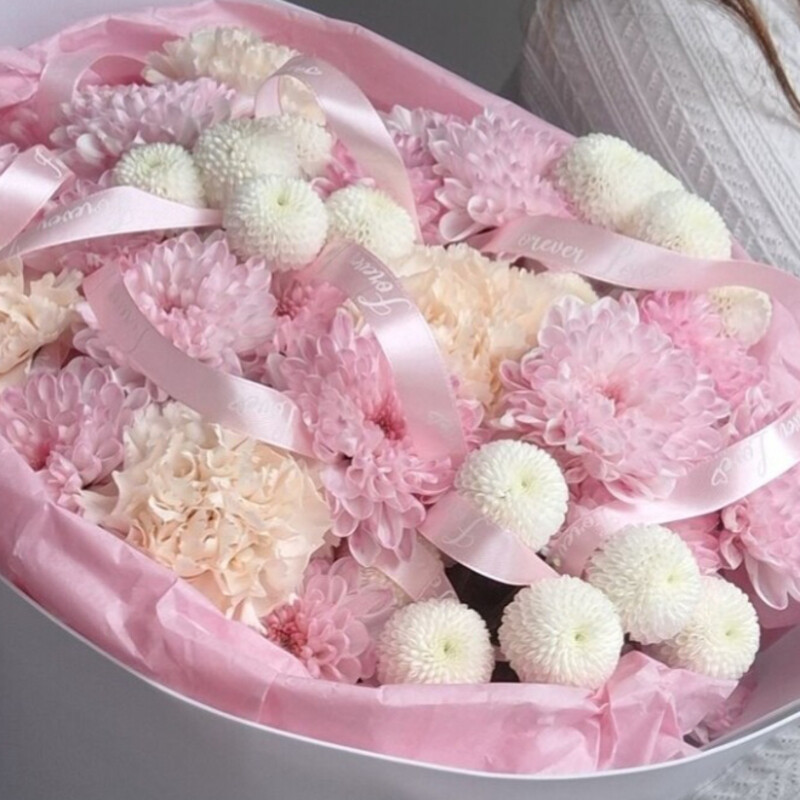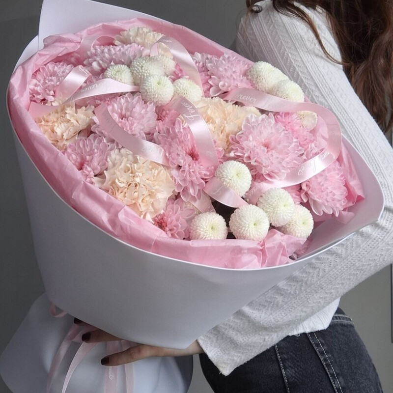 Авторский букет «Зефир» — это изысканная композиция из кустовой хризантемы, хризантемы Сантини и гвоздики. Букет упакован в атласную ленту и украшен оформлением с использованием тишью. Подходит для любых случаев и идеален в качестве подарка для близких и коллег.