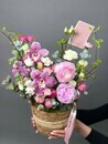 - Букет с пионом, орхидеей и ранункулюсом в плетенной корзине