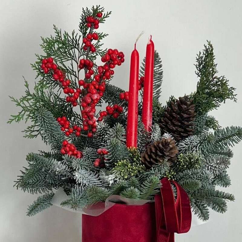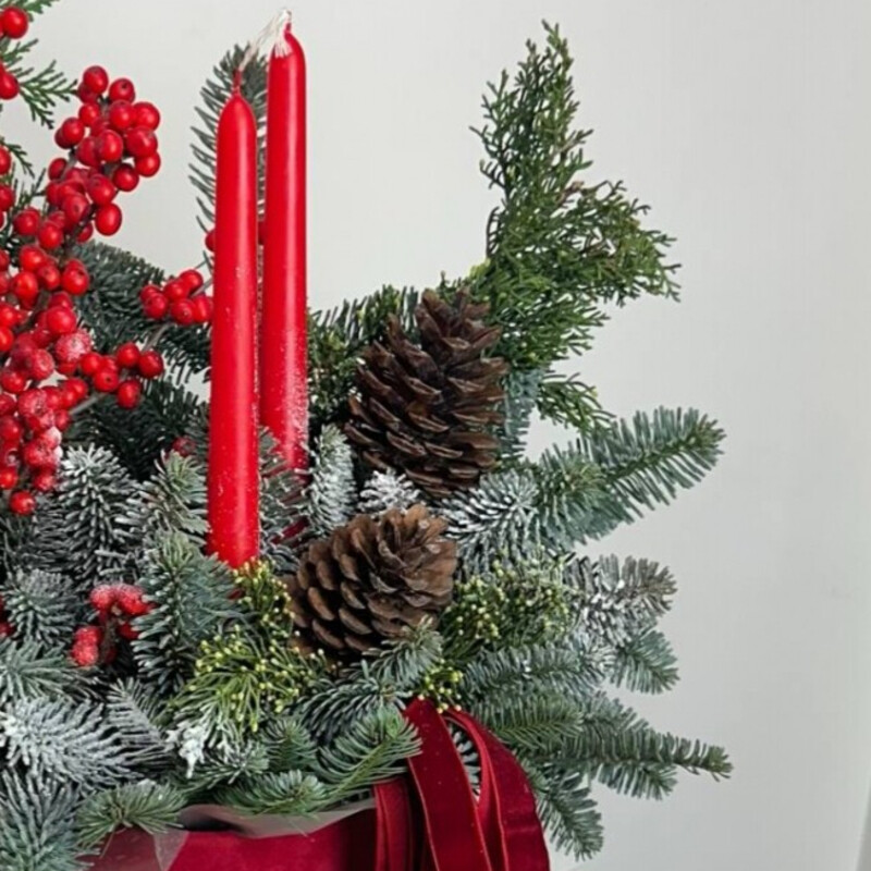 Новогодняя композиция в ярко-красной бархатной шляпной коробке — воплощение праздничной роскоши и безупречного вкуса. Живые ветви нобилиса и туи не осыпаются и не желтеют, длительно сохраняя свежесть и благородный аромат зимнего леса. Алые ягоды илекса, кедровые шишки и изящные красные свечи создают атмосферу тепла и торжества. Это не просто декор, а искусно собранный символ праздника, в котором каждая деталь продумана до совершенства. Композиция станет центральным акцентом праздничного стола или изысканным подарком тем, кто ценит эстетику и качество премиум-класса.