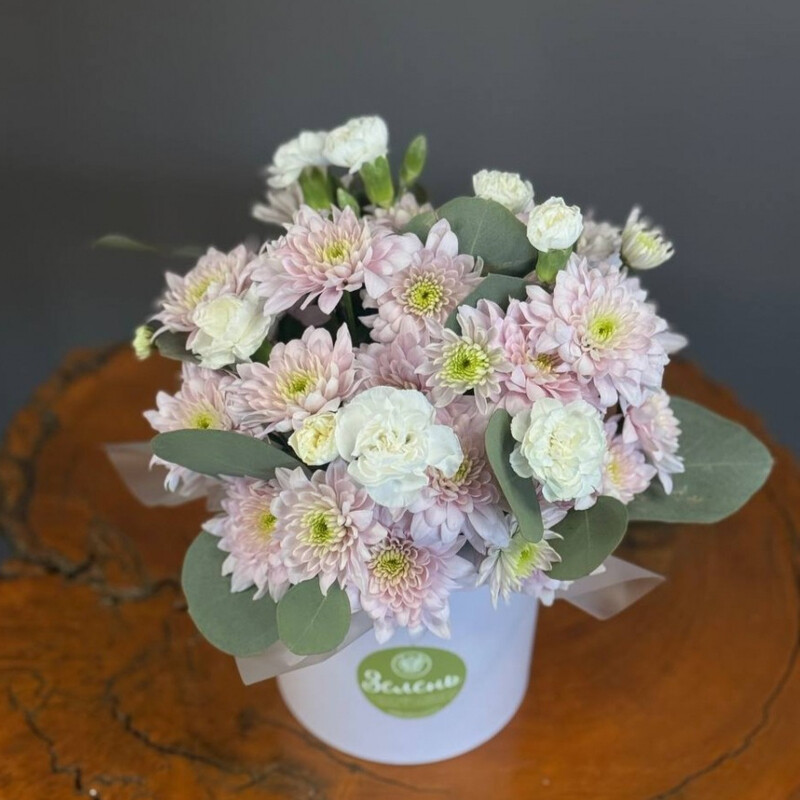 - Цветочная композиция из хризантем в шляпной коробке с эвкалиптом