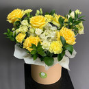Ярко-желтая композиция с розами в шляпной коробке