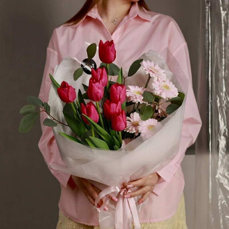 - Авторский букет из гербер и малиновых тюльпанов