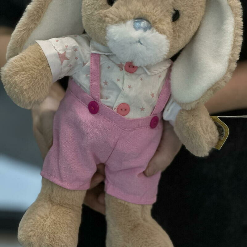Зайчик-непоседа в модном комбинезоне! Полон очарования и готов к любым играм. Подарите ребёнку самого стильного и мягкого друга!