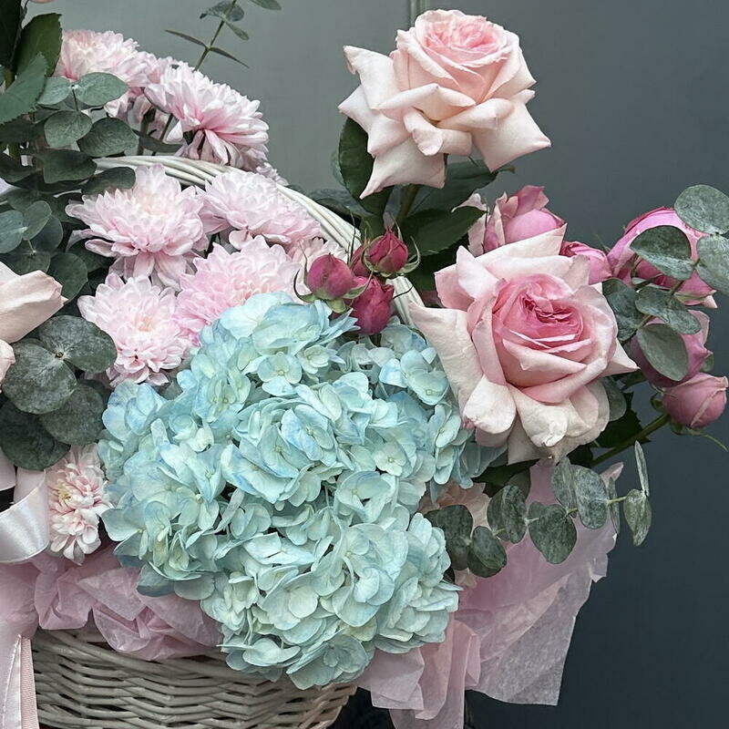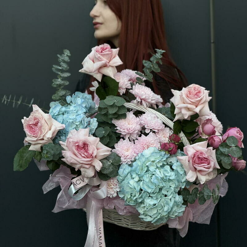 Нежная композиция в небесно-розовых тонах, где пушистые пионовидные розы создают ощущение воздушного облака. Идеальный романтичный образ.