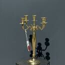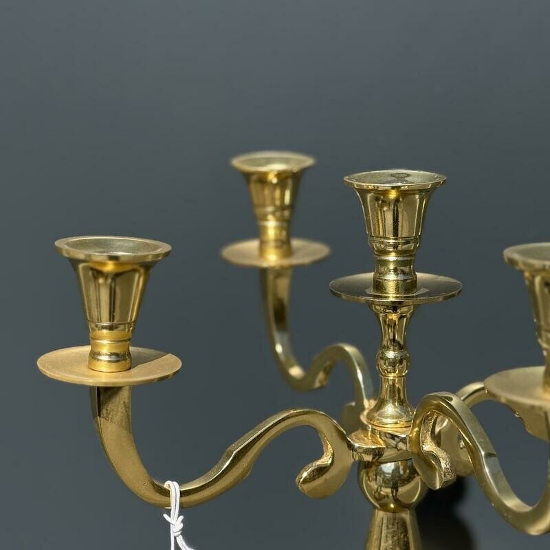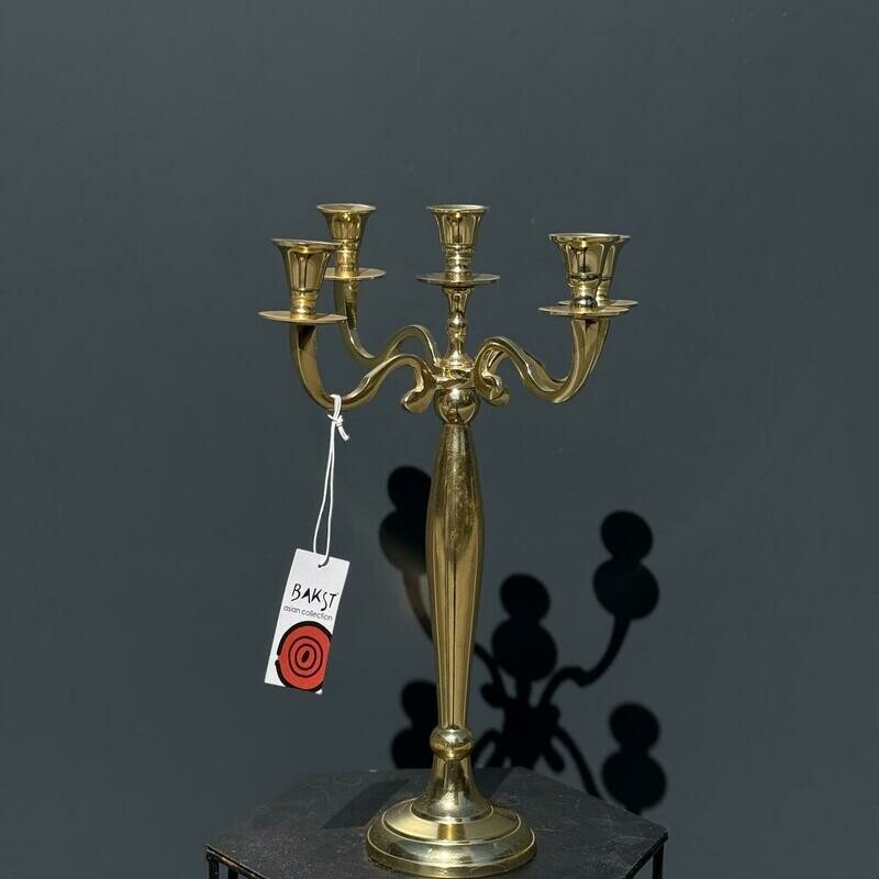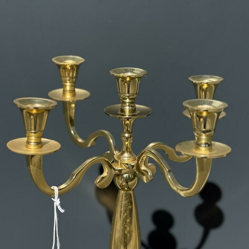 Элегантный золотой подсвечник из металла станет стильным украшением любого интерьера. Его строгие линии и сияющий металлический оттенок создают атмосферу торжественности и уюта. Подходит для использования с пятью свечами, он станет прекрасным акцентом на праздничном столе или в качестве декоративного элемента в доме.