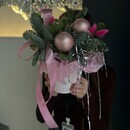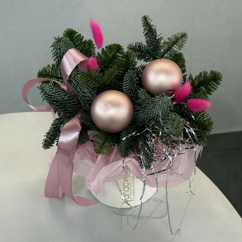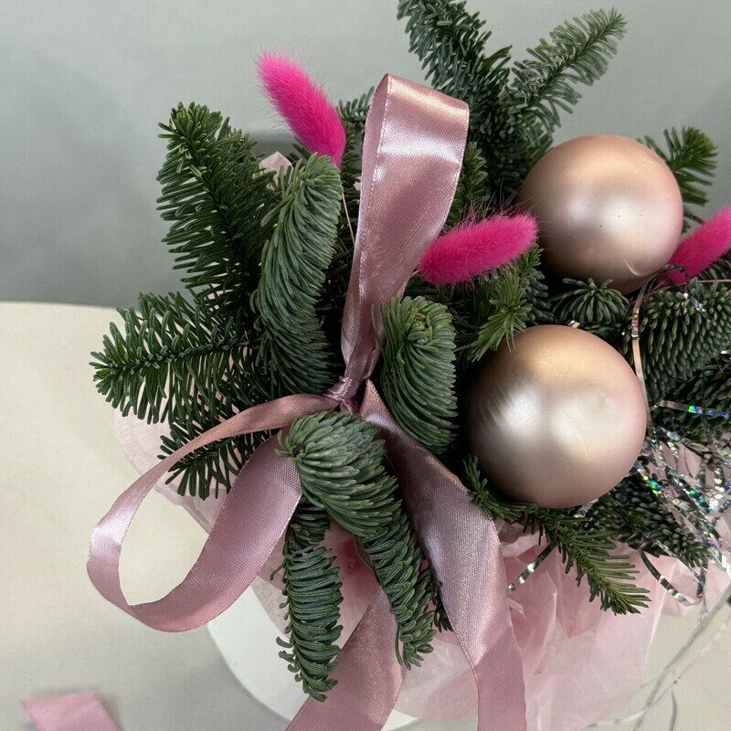 Этот букет — маленькая зимняя сказка: пушистый изумрудный нобилис переплетается с пудровыми, розовыми шарами и пушистыми лагурусами, а шелковистые ленты придают композиции мягкость и изящество.