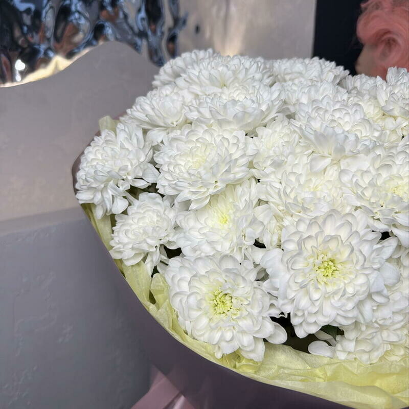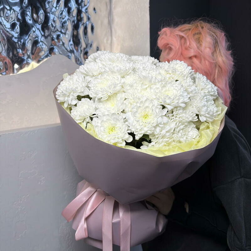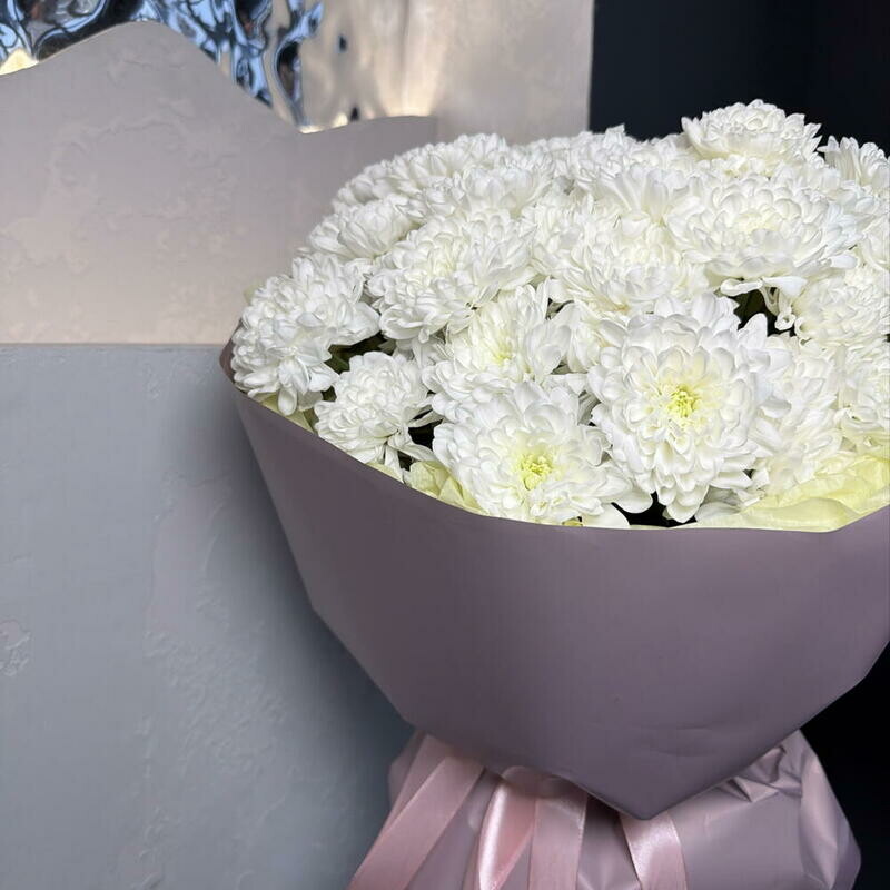 Нежный букет белых хризантем в пастельной упаковке — чистота, элегантность и искренние эмоции в каждом цветке. Идеально для подарка или декора — свежесть и быстрая доставка. Закажи и впечатли!