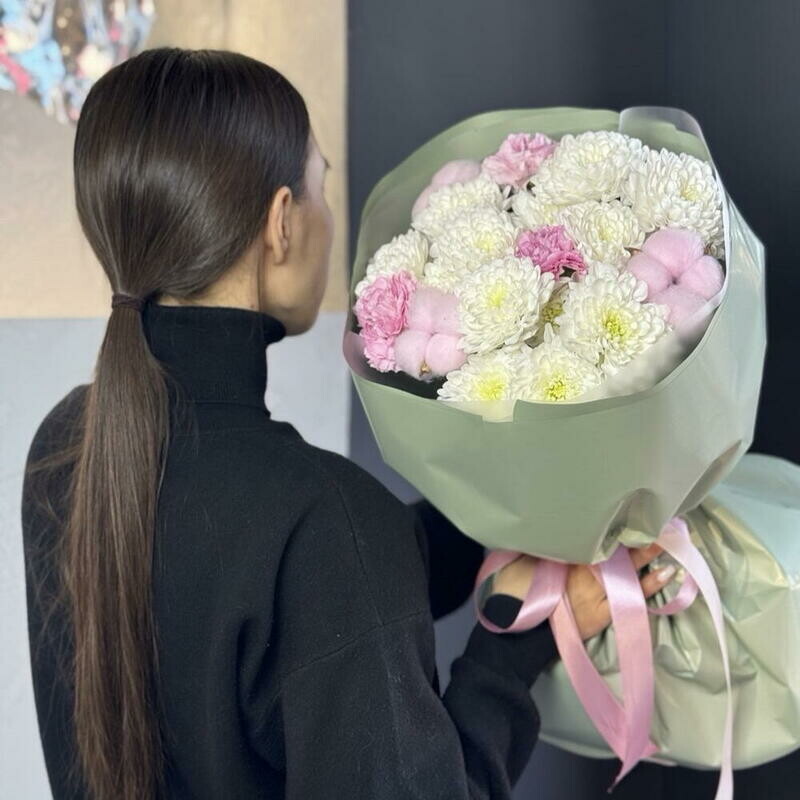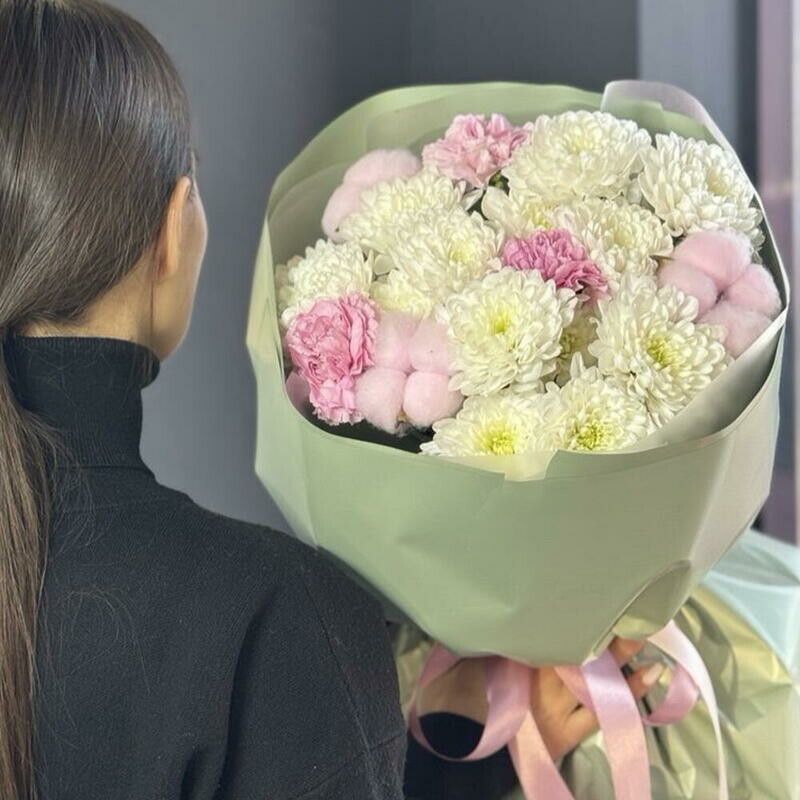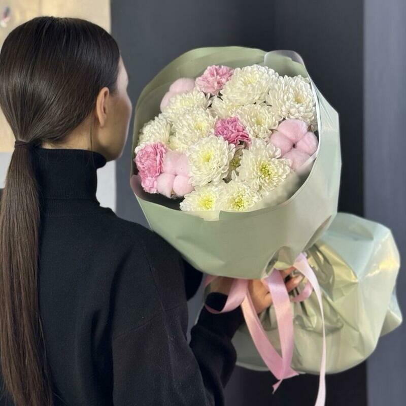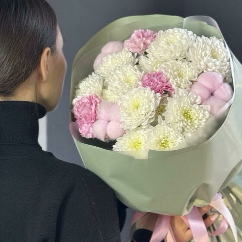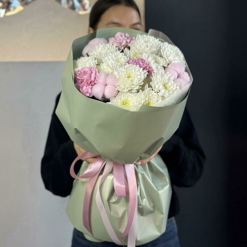 Сборный букет с кустовыми хризантемами, диантусами и хлопком, стандартный