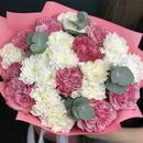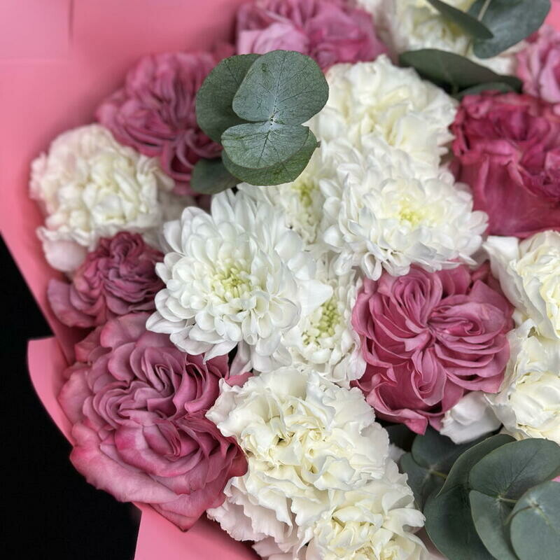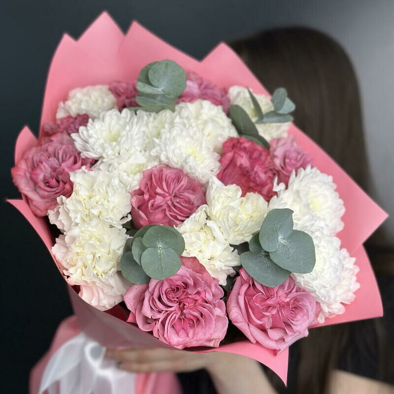 Авторский букет с пионовидными розами, диантусами и эвкалиптом, премиум