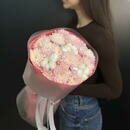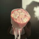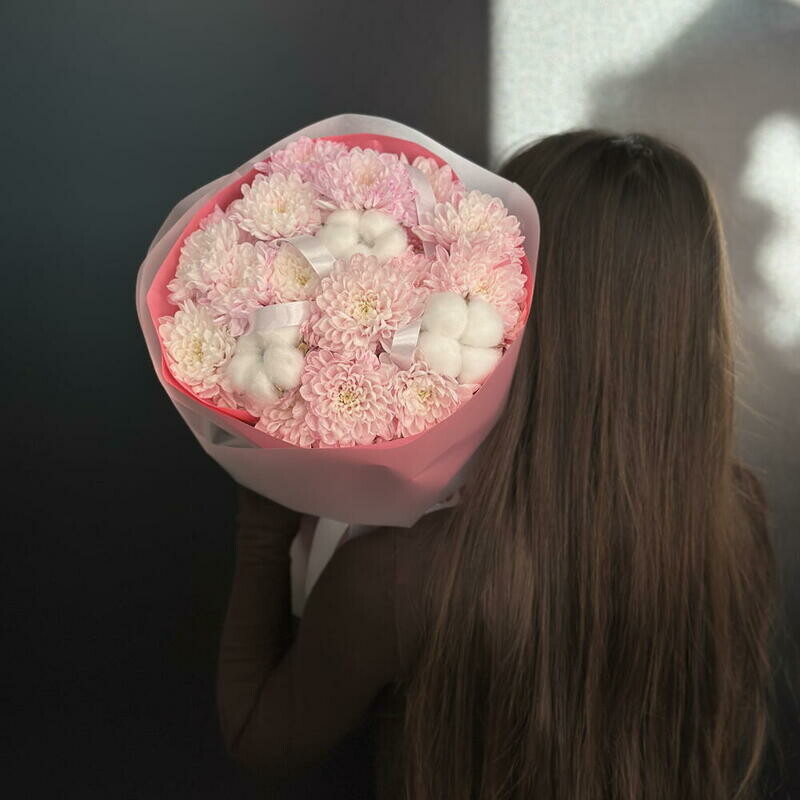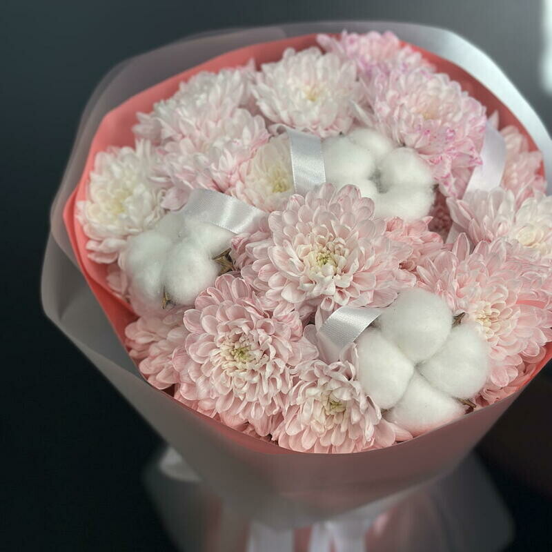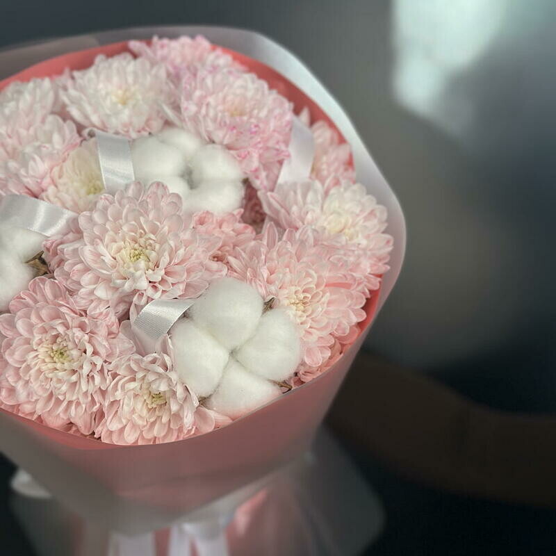 Нежность в чистом виде. Пудровые хризантемы в объятиях воздушного белого хлопка. Букет, который будет радовать долго.