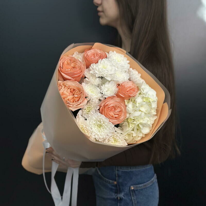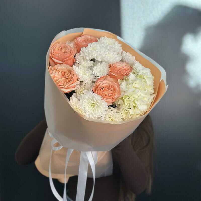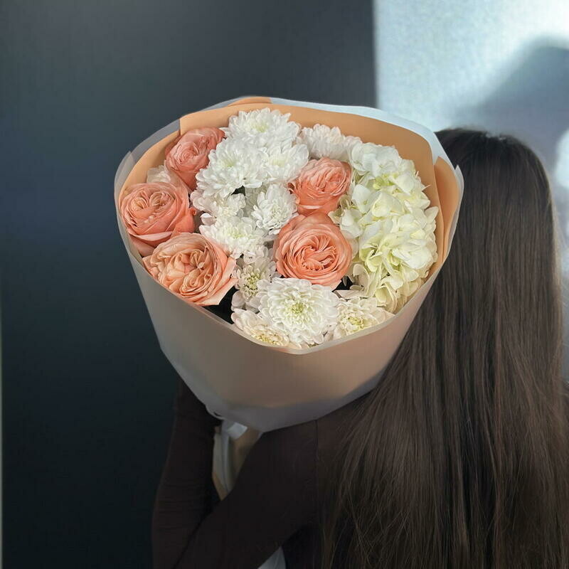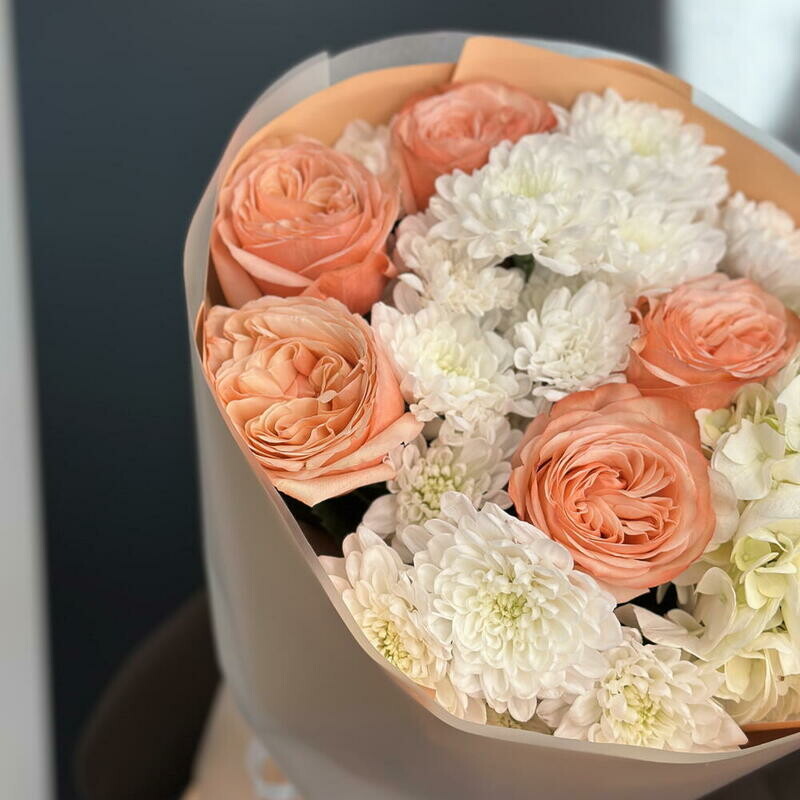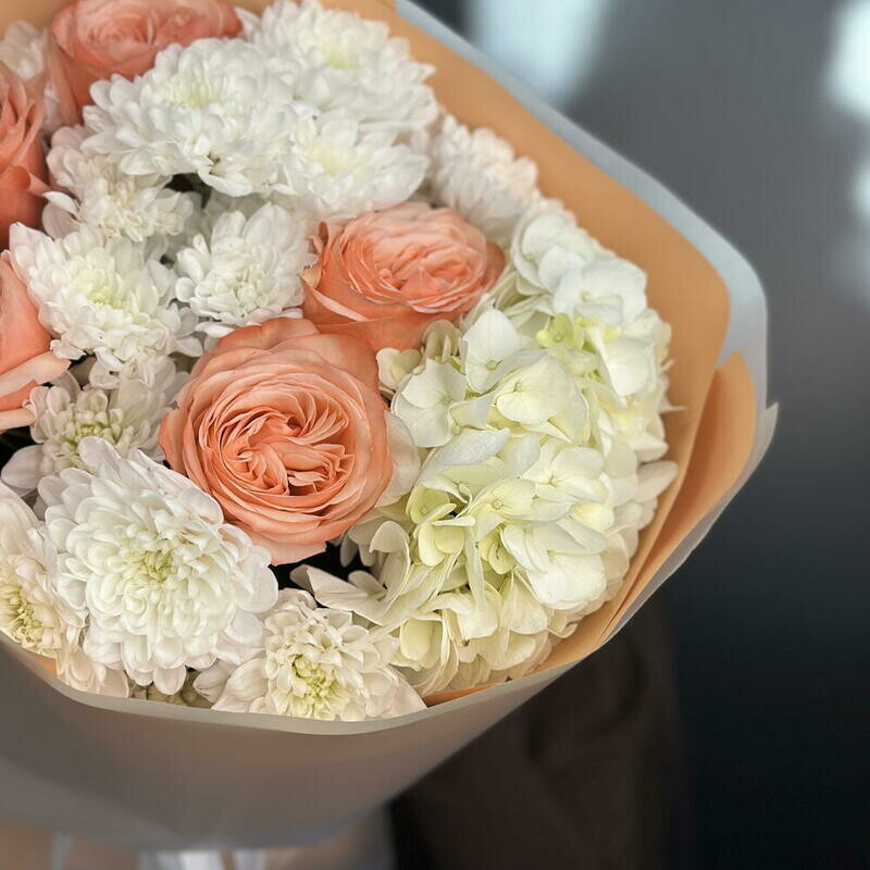 Сборный букет со стойкой кустовой хризантемой в сочетание с пионовидными розами сорта «Кахала» и воздушной гортензией.