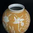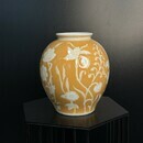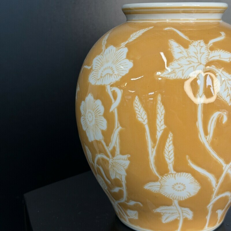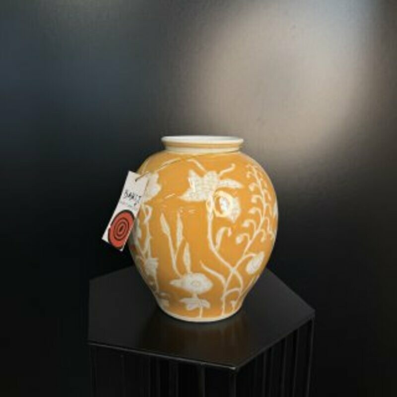 Глазурованная керамическая ваза тёплого медового оттенка с изящным белым цветочным орнаментом. Идеальна как акцентный арт-объект или для букета — придаст интерьеру уютную, солнечную нотку. Отличный выбор для гостиной, прихожей или рабочего кабинета; добавьте теплую элегантность в ваш дом.