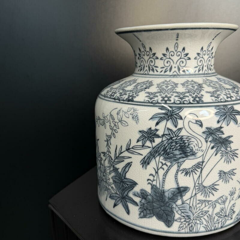 Элегантная керамическая ваза в классической синей гамме с изящным орнаментом журавлей и трав — тонкий акцент восточной эстетики для любого интерьера. Стильный центр стола или комода: под живые цветы или как самостоятельный артобъект. Превратите пространство в уголок спокойствия и изящества.
