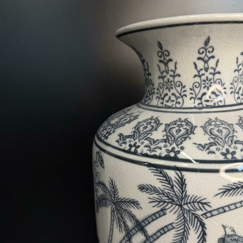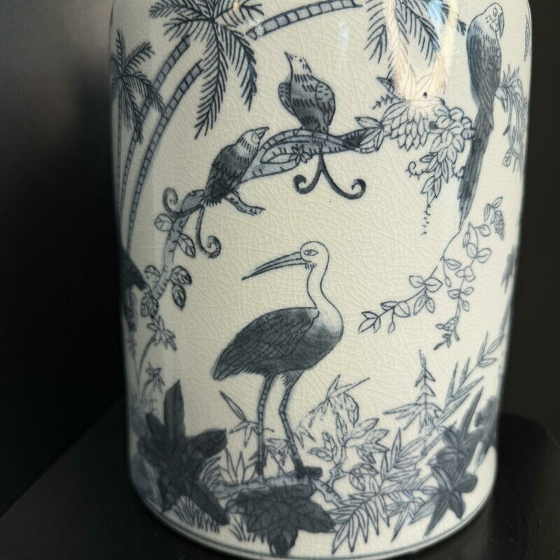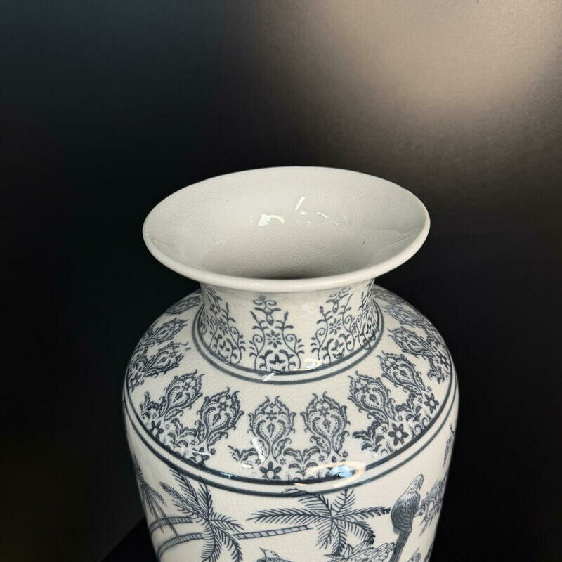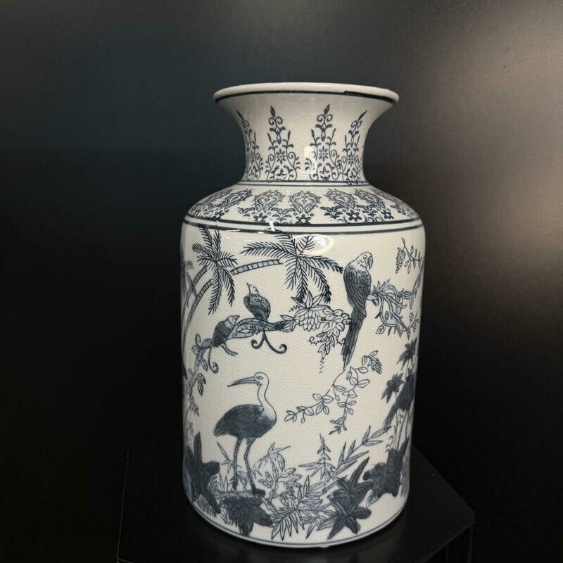 Стильная синебелая керамическая ваза с изящной графикой птиц и тропической растительности — сочетание восточной утончённости и современной лаконичности. Прекрасный акцент для гостиной или прихожей: выглядит эффектно как самостоятельно, так и с одной длинной веткой или букетом, добавляя интерьеру характер и гармонию.