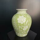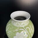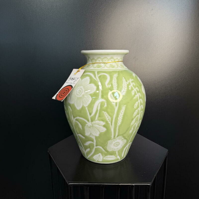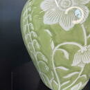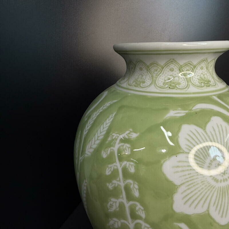 Нежная керамическая ваза с яблочнозелёной глазурью и рельефным цветочным орнаментом — утончённое сочетание рукотворного тепла и современного стиля. Идеальна как центровой акцент в интерьере или элегантный подарок: подойдёт как для свежих букетов, так и для сухоцветов.