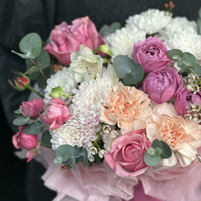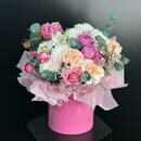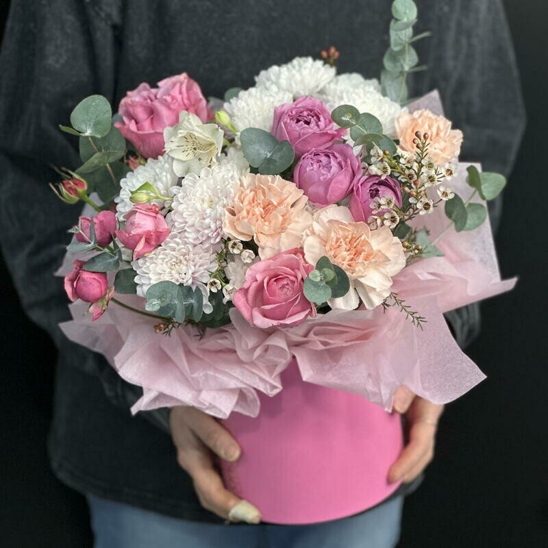 Нежная цветочная композиция в шляпной коробке в розово-персиковой гамме. Пионовидные розы, хризантемы, диантусы и эвкалипт создают воздушный и элегантный образ. Идеальный вариант для дня рождения, 8 Марта, годовщины, свидания или подарка без повода. Композиция выглядит стильно, долго сохраняет свежесть и не требует вазы — просто дарите эмоции
