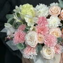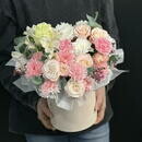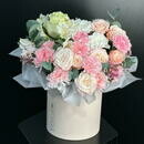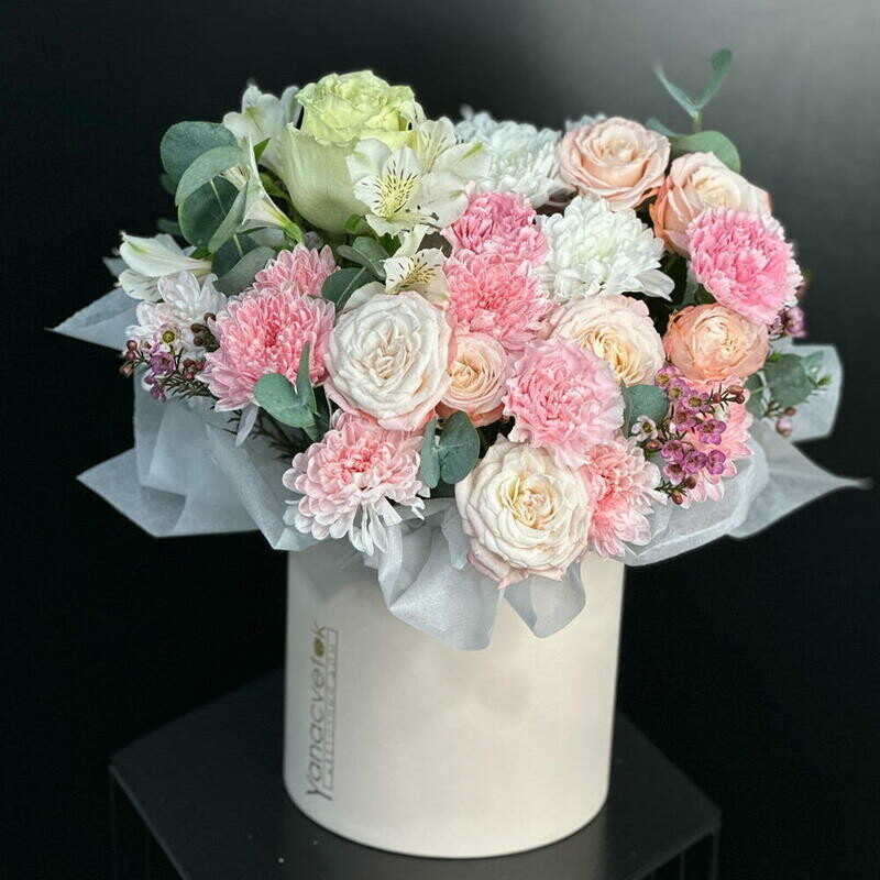 Нежная цветочная композиция в шляпной коробке в розово-персиковой гамме. Пионы, розы, хризантемы и эвкалипт создают воздушный и элегантный образ. Идеальный вариант для дня рождения, 8 Марта, годовщины, свидания или подарка без повода. Композиция выглядит стильно, долго сохраняет свежесть и не требует вазы — просто дарите эмоции