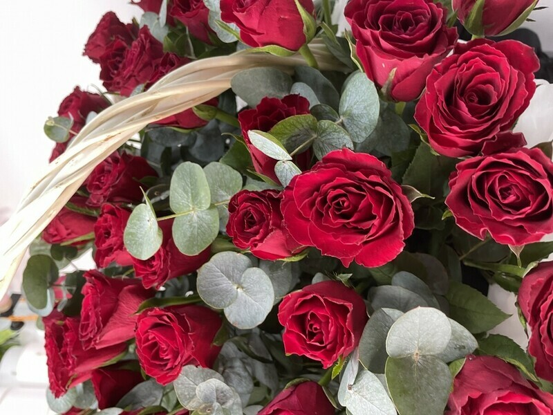 - 101 Кенийская красная роза с эвкалиптом в корзине