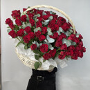101 Кенийская красная роза с эвкалиптом в корзине