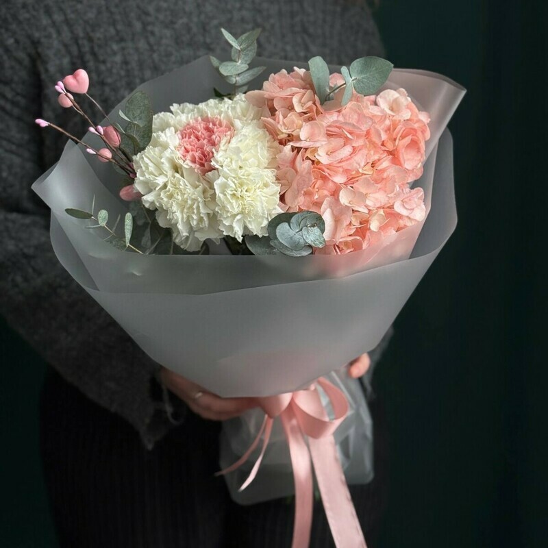 Дуо-букет из гортензии и диантусов с эвкалиптом и романтичными декоративными веточками готов отправиться на доставку прямо сейчас и радовать вашего получателя (маму, бабушку, тетю, сестру, девушку, жену, коллегу, подругу) красивыми цветами Бережно упакуем и отправим на доставку курьером В холодное время года упакуем в утеплитель, чтобы ничего не замерзло:)