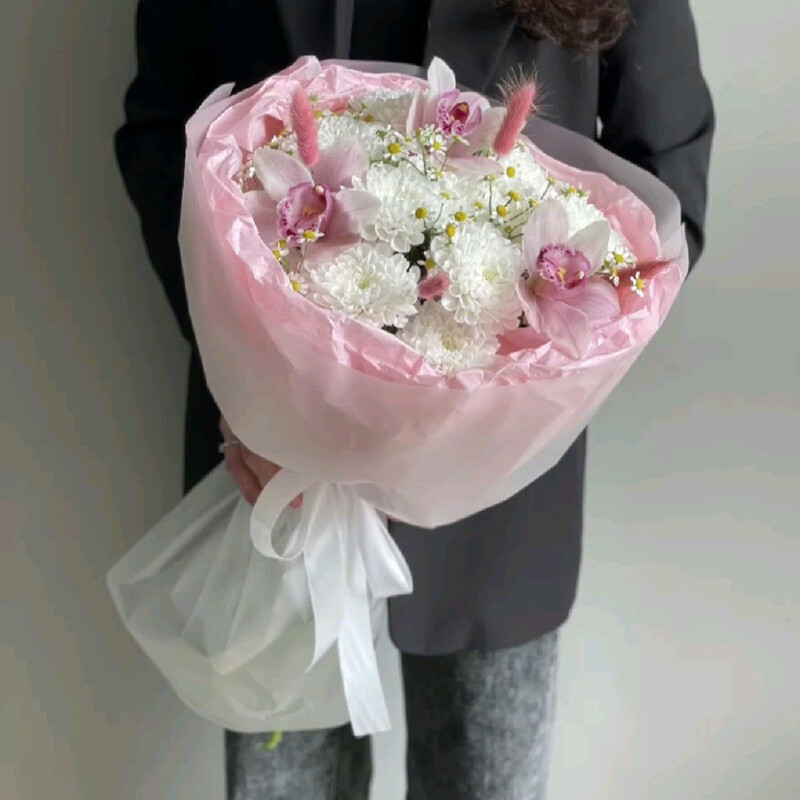 Авторский букет «Любимка» — это изысканная композиция, объединяющая орхидею цимбидиум, кустовую хризантему и ромашку Камилла. Подходит для выражения самых нежных чувств. Идеален для любых торжеств и не только.