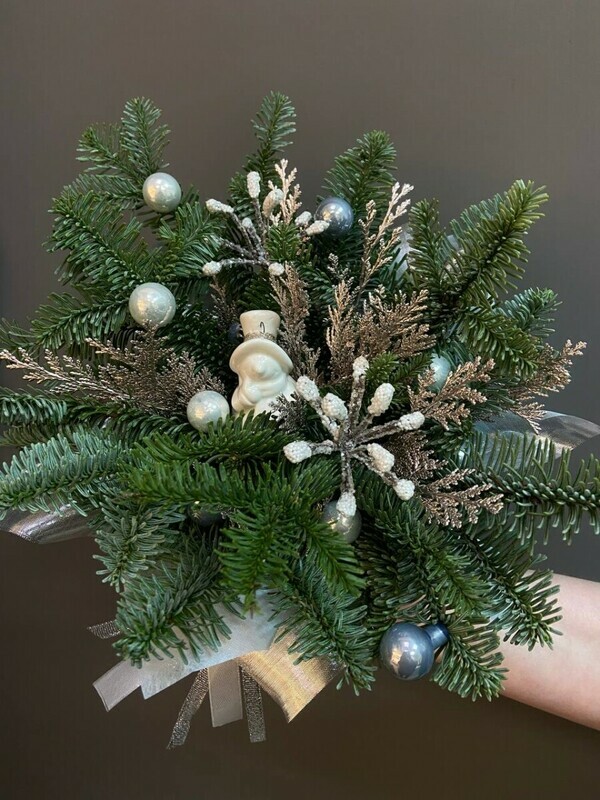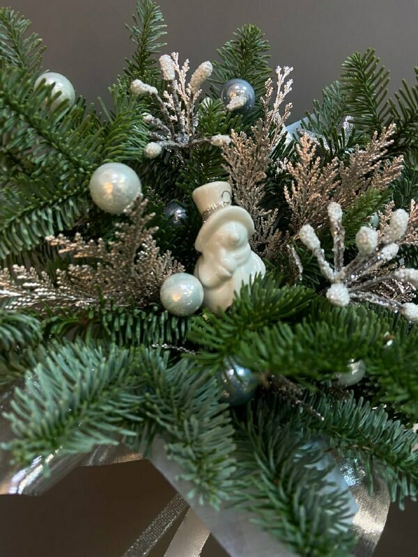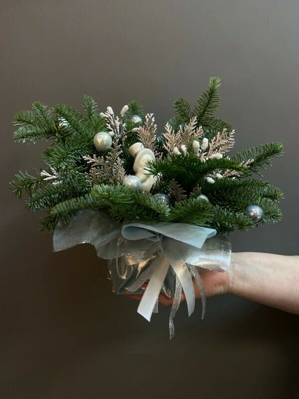 Эта новогодняя композиция словно выхвачена из зимней сказки: в её сердце — величественный нобилис, чьи глубокие изумрудные ветви источают насыщенный, смолистый аромат хвои, напоминающий лесную тишину в рождественскую ночь.