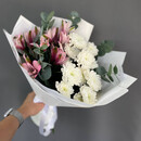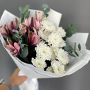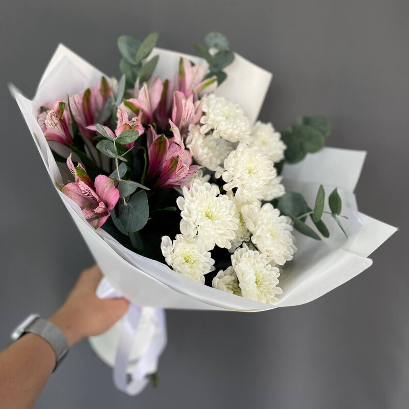 - Нежный букет хризантема, розовая альстромерия и эвкалипт