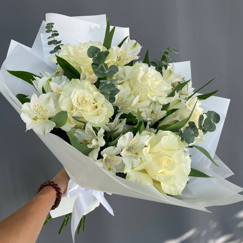 - Нежный букет белая французская роза, альстромерии и эвкалипт