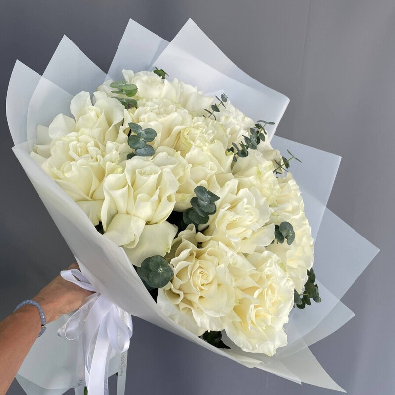 - Букет белая французская роза Мондиаль и эвкалипт