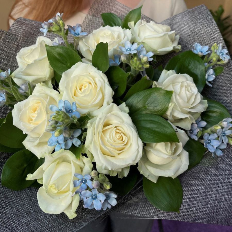 Нежнейший букет в сером льняном полотне из роз Аваланж в невероятном сочетании с голубыми бархатными цветочками оксипеталум.