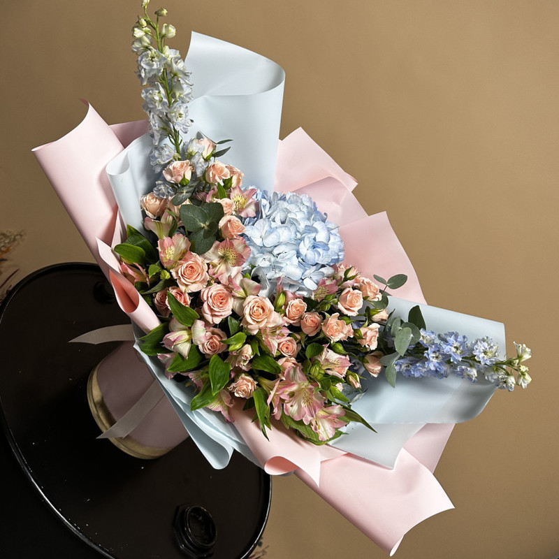 стильный букет из гортензии, кустовых роз, дельфиниума