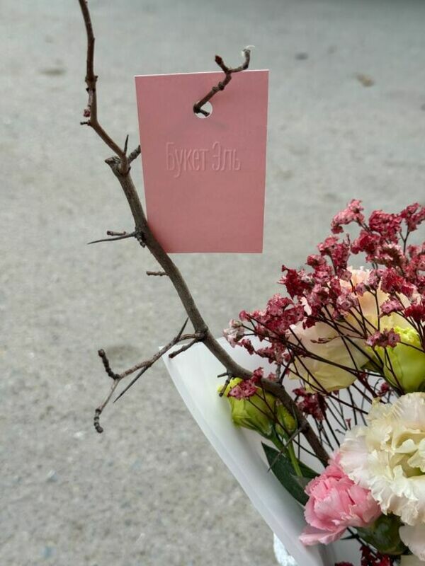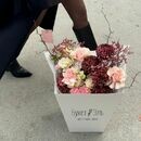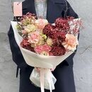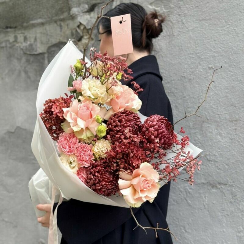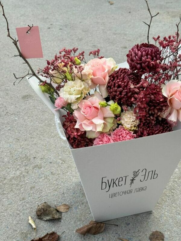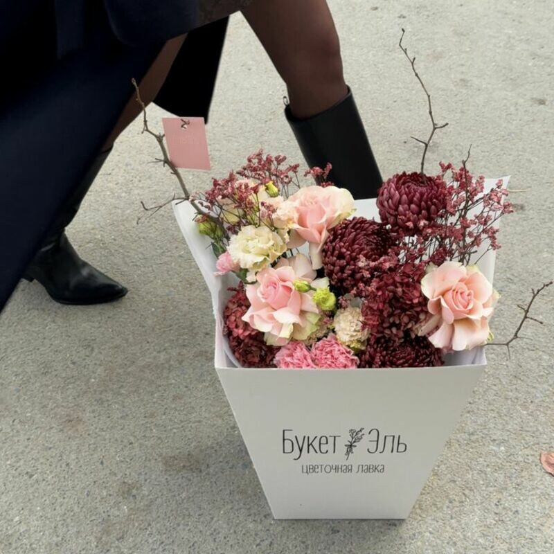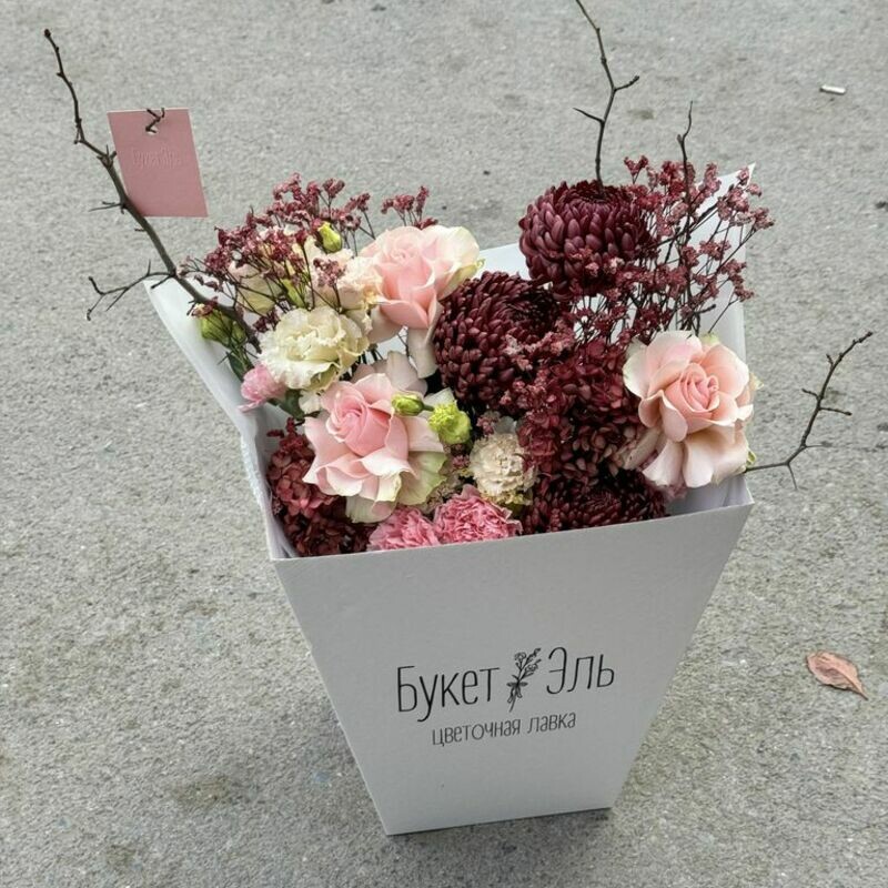 Состав: Одноголовая хризантема - 3 шт; Диантус (гвоздика) - 5 шт; Лимониум - 4 шт; Гортензия стабилизированная - 0,5 шт; Роза Эквадор - 3 шт; Эустома - 3 шт; Ветки садовые; Упаковка модная; Лента бархатная - 1 шт; Карточка; Переноска (размер L); Бесплатная открытка. Размер: Высота - 50 см, Ширина - 40 см.