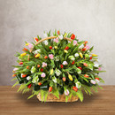 Крупная плетёная корзина, полная нежных разноцветных тюльпанов красного, жёлтого, белого, розового, зелёного и фиолетового оттенков станет ярким, незабываемым сюрпризом для самых любимых. Такой цветочный фейерверк захватывает дух и вызывает самые позитивные и светлые эмоции.