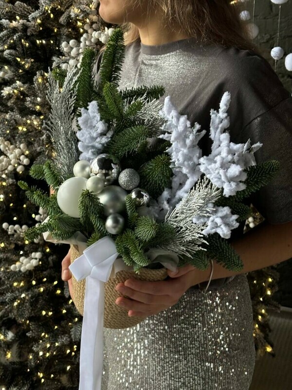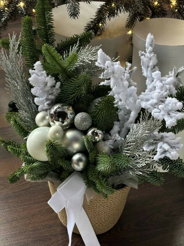 - Новогодняя композиция из нобилиса в джутовом кашпо