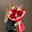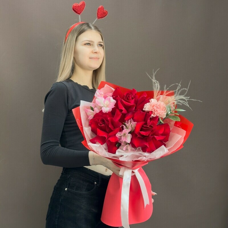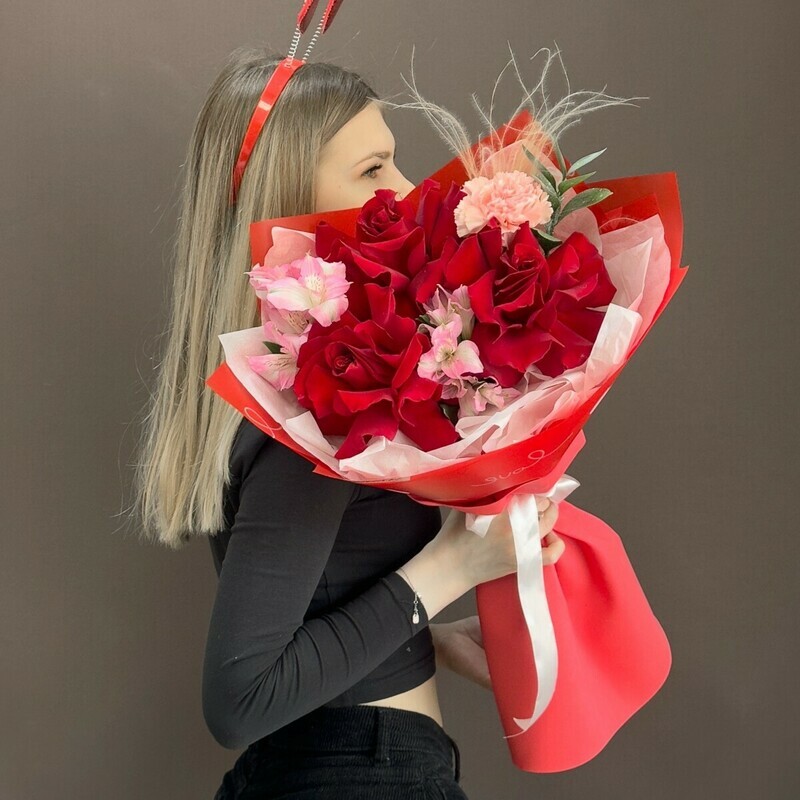 Изысканный букет — идеальный подарок для любого особого случая. В состав входят насыщенно-красные розы, дополненные нежными светло-розовыми альстромериями и гвоздикой, создающими гармоничный и выразительный образ. Украшен стильной красной упаковкой с белой лентой, который подчеркивает яркость и элегантность цветов. Подарите эмоции и красоту близким с этим букетом, он точно вызовет улыбку и останется в памяти.