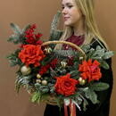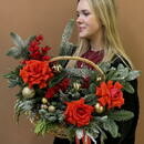 Новогодняя корзина с розами и натуральной пихтой, стандартный