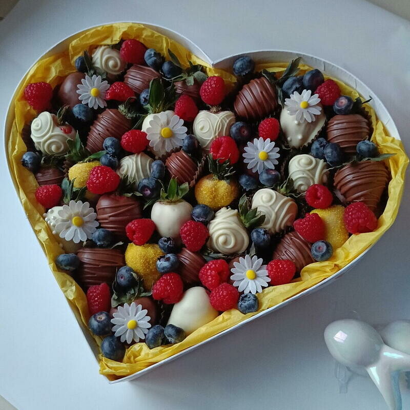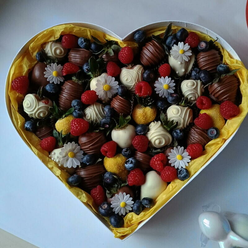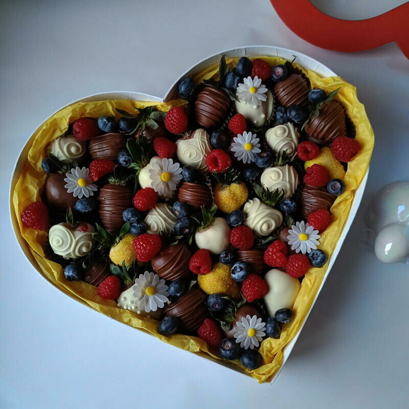 Сердце L с клубникой в шоколаде и съедобными ромашками