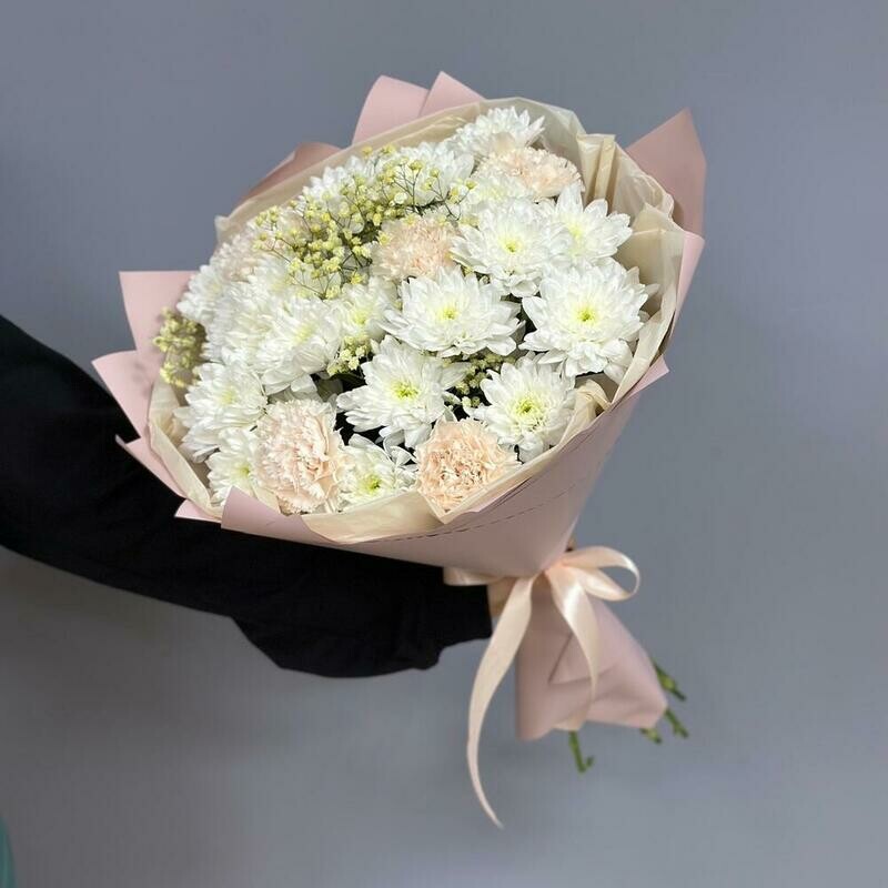 - Букет с диантусами, кустовой хризантемой и гипсофилой