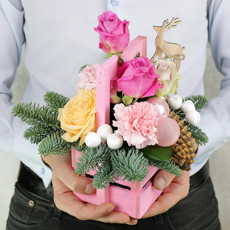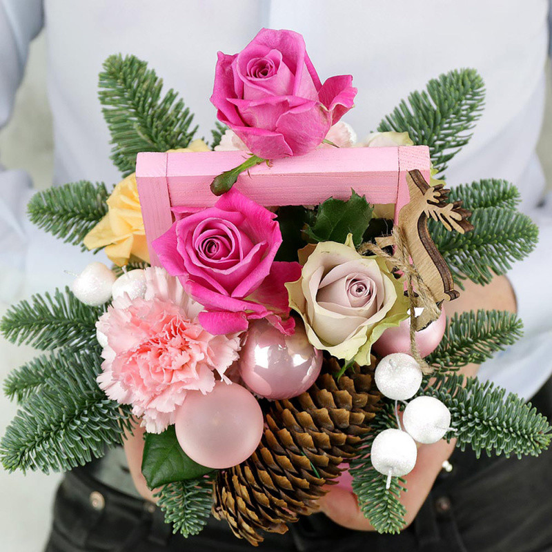 - Новогодняя композиция из ёлки, роз, шишки и гвоздик с декоративными вставками